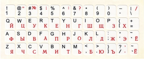 Наклейки на клавиатуру нестираемые, матовые, рус/лат, 11х13 мм, 112 симв., белый фон, русские буквы красные